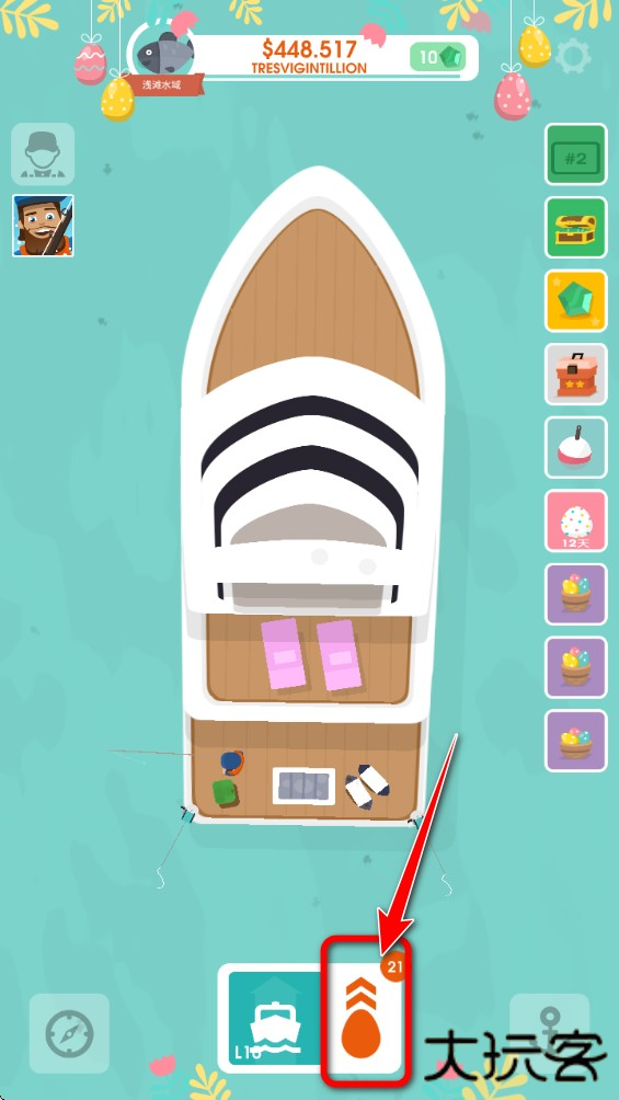 4.查看底部菜单栏。 利用其中的商店购买新鱼竿或升级现有装备,提升钓鱼能力。