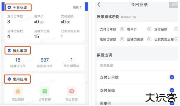 2、在“首页”,用户能看到“今日业绩”、“待办事项”和“常用应用”这三个模块。“今日业绩”包括支付数据、售后数据、店铺数据和财务数据,可以进一步细分成“支付订单数”、“支付金额”、“店铺访客数”、“已发货售后量”等,用户可以根据需求自定义显示的数据。