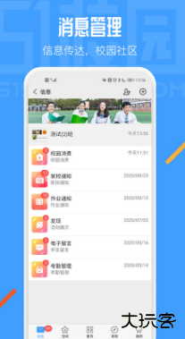2、实时推送家校通知、作业提醒、考勤动态及校园活动信息,支持多维度消息分类查看。