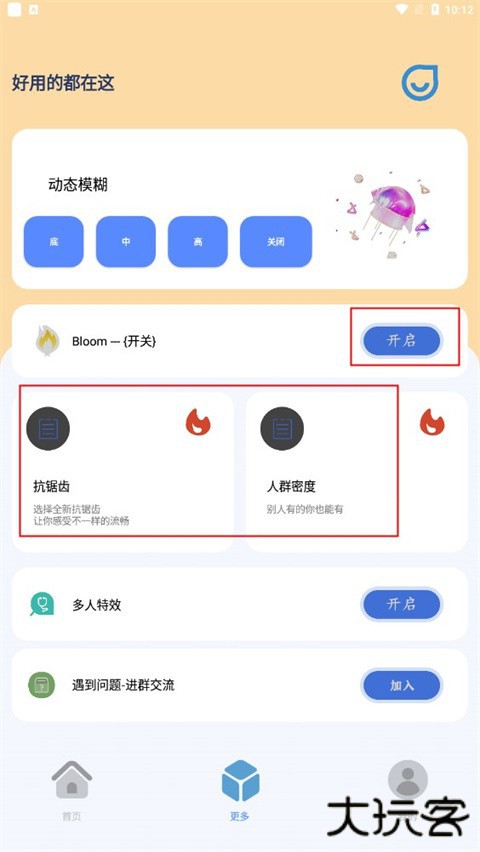 4、点击最下方中间的更多,将页面中的特效、动态模糊都开启