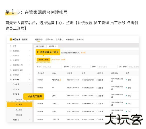 首先,用户需要进入管家后台,选择“运营中心”,然后点击“系统设置”,在“员工管理”下找到“员工账号”选项,点击“创建员工账号”来设置新的账户。