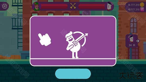 3、在游戏中玩家需要控制火柴人在关卡中和敌人进行射击对战,不断地滑动屏幕控制射箭的角度和力度。