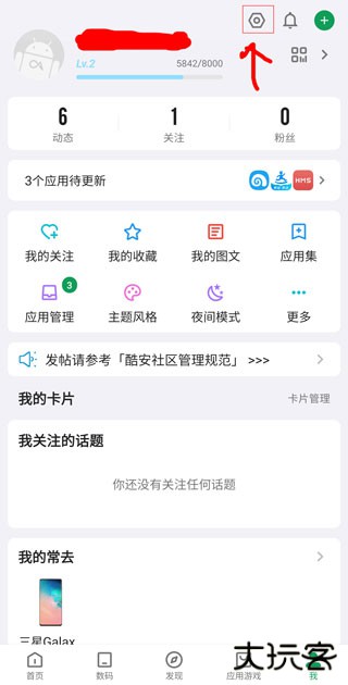 1.下载并安装酷安app,完成后打开软件,点击右上角的设置选项