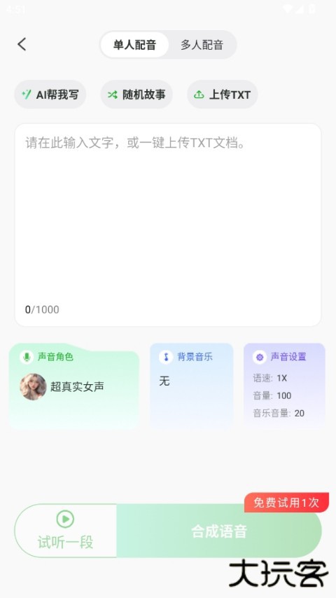 4、并且还能设置多人配音,就可以直接输入文字,或一键上传TXT文档。