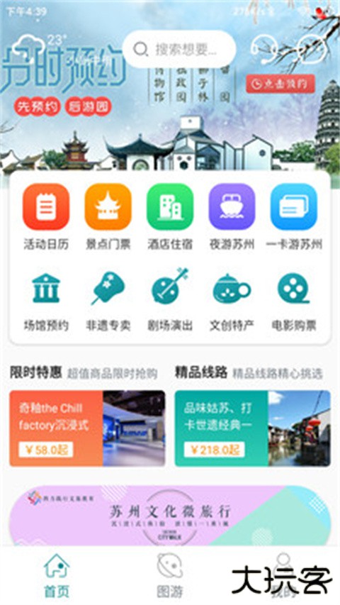 1、官方平台:通过“君到苏州”微信公众号或官网(https://m.cloud.sz-trip.com/)进入【文旅商城】,选择【景点门票】或【场馆预约】,填写个人信息并选定时段。