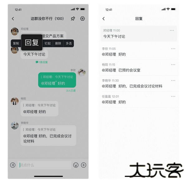 使用路径:长按消息气泡选择【回复】->输入框发送回复内容->点击原文消息下方回复数进入回复详情页。