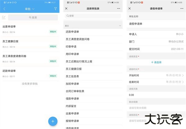 企业自定义审批流程,员工打开工作台的审批应用,手机随时随地提交审批。