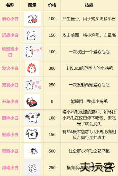 4、首先种植抱着爱心的小白,它会持续产出“爱心”,功能类似阳光,可用于购买与部署其他类型的小白,值得一提的是,敌方小鸡毛不再“吃植物”,而是通过“舔”小白的方式来消除防御,趣味十足。