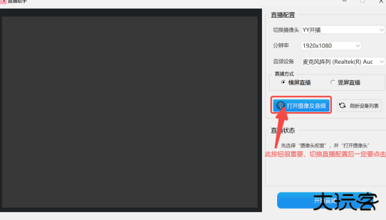 3、进入直播助手弹窗,切换摄像头,选择分辨率,选择音频设备,选择直播方式;每次上述要素选择完成后,一定要点击一次【打开摄像及音频】按钮。