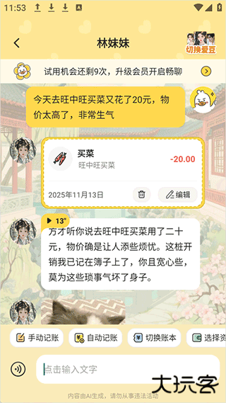 用户可以通过与虚拟角色对话的方式完成收支录入,无需手动输入金额或类别。AI会根据语句自动识别消费类型,实现更轻松的账单记录体验。语音识别速度快,适合多种日常场景。