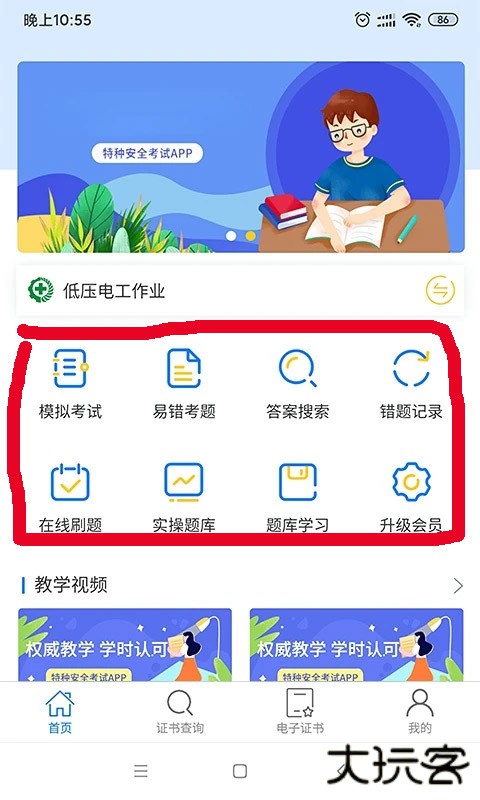 1、打开特种安全考试,有首页、证书查询、电子证书和我的版块,首页有模拟考试、在线刷题、题库学习等功能;