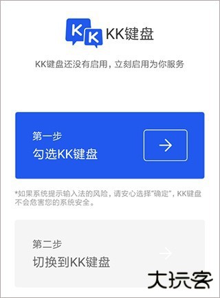 1、在手机上运行软件,选择首页里的“勾选KK键盘”按钮,去打开设置功能里启用KK键盘;
