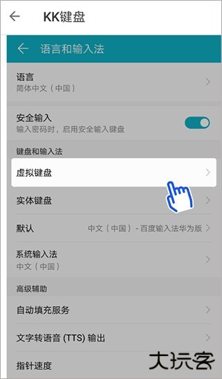 3、还可以选择去手机的设置页面里找到“语言和输入法”功能,从“虚拟键盘”的功能里设置KK键盘为默认输入。