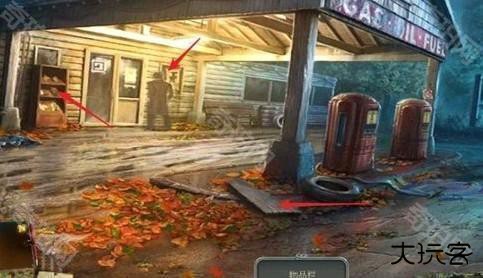 我们来到下街道后看到一个鬼鬼祟祟的人,点击他他就会快速离开,我们在左边柜子里获得线索,同时在加油机处获得了木板,我们返回镇上。