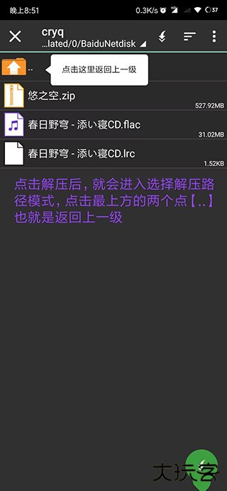 点解压后,会进入路径选择界面,点击ZA上方的【】两个点,也就是“返回上一级”的意思