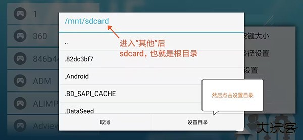 会有一个“其他”点击它,就会跳转到根目录了,再点击下方的“设置目录”就可以把模拟器的默认路径设置到手机的根目录了