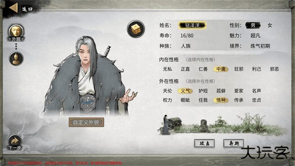 玩家可自定义角色属性、天赋、功法,以及道德立场(正邪两道),并通过决策影响角色的性格、声望与人际关系,实现高度个性化的角色成长。