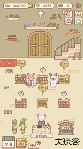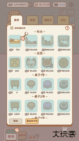 2.在装修界面可以自由设计店铺风格,通过添加新食谱、购置漫画书和装饰背景来提升店铺吸引力,吸引更多猫咪顾客光临。