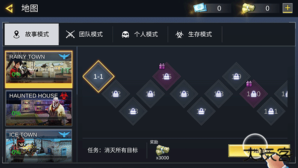 2、进入游戏大厅界面,仔细查看提供的四个主要模式:故事模式、团队模式、个人模式、生存模式。根据个人喜好选择其中一个模式进入。
