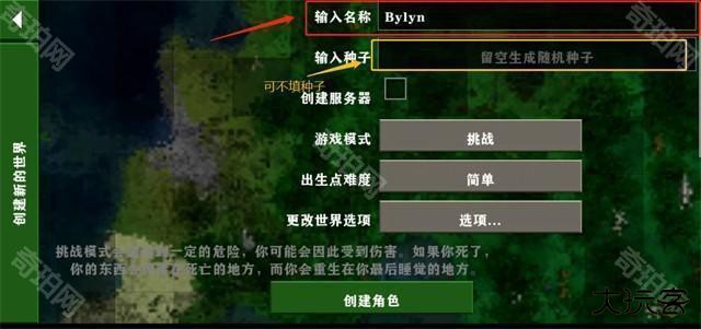 ③点击【输入名称】框内修改服务器名字(不是角色名字),【输入种子】框可不点,会随机地图