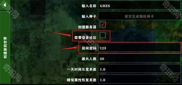 首次创建服务器的要取!消!勾!选!【需要登录社区】,因为现在社区已经登录不了了,但不会影响联机。房间秘密也可以在这里设置。