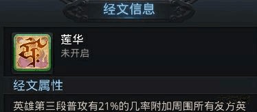 注解 :莲华经文的效果,类似于罗睺经文,如果对它不怎么理解的话,你可以把他当成另一个罗睺经文,他和罗睺经文的效果相差不多。罗睺经文是释放技能后,下一次普攻附带自身物理强度+ 法术强度之和 16.5% 的法术伤害。而莲华经文,是第三段普攻 21% 几率附加周围所有友方英雄物理和法术强度之和 0.5% 的伤害。