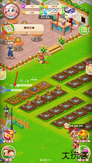 2、种植完成后,使用水滴道具为花朵补充水分,促进其生长。