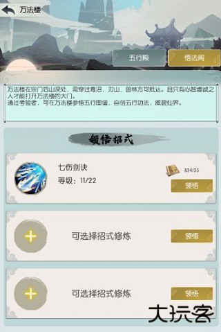 悟法阁:用于突破原有招式等级上限(10 级以上) 的场所。