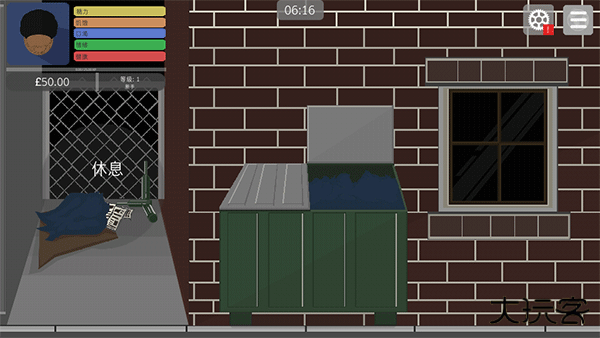 1、主界面呈现角色在床上睡眠状态,同步显示精力值、饥饿度、口渴值及情绪值等生存指标。