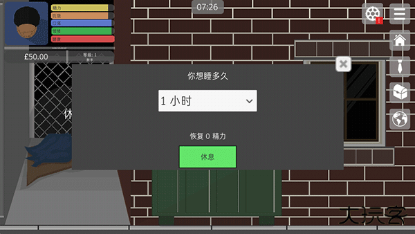 2、点击 "休息" 按钮可设定睡眠时长,睡眠时间与精力恢复值呈正比关系。