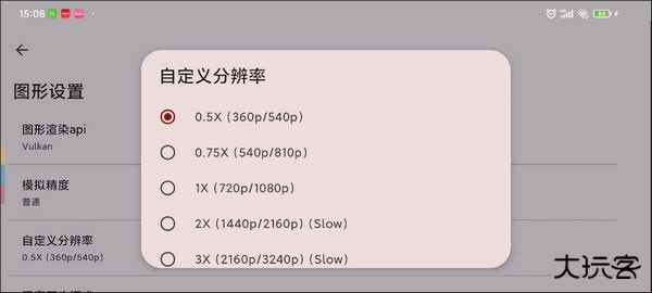 6、如果手机配置比较差,比如骁龙6系处理器打完官方驱动后其实也能勉强模拟switch,在这里把yuzu的模拟分辨率改成0.5倍(360x540),用最低的分辨率总能运行吧。