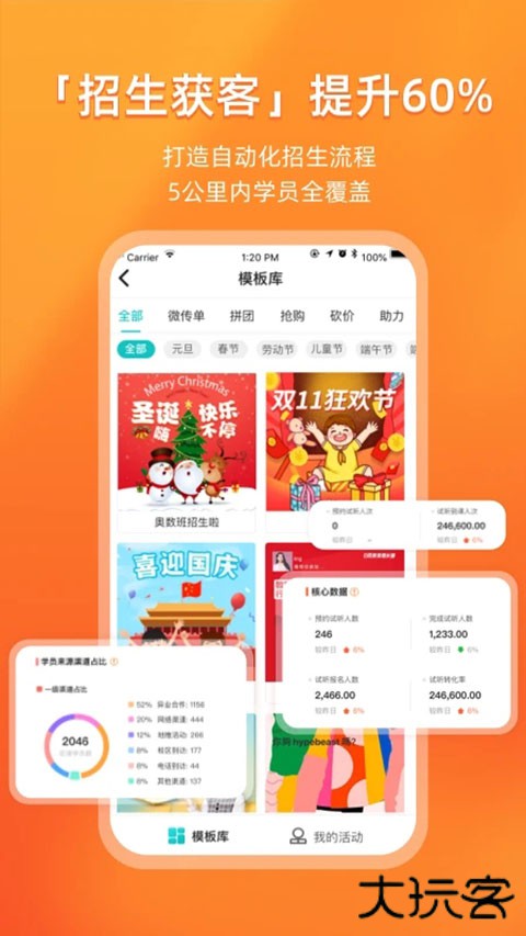 活动模板:系统提供拼团、砍价、助力等200+招生模板,机构可一键套用,快速生成活动方案,通过微信等社交渠道裂变传播。