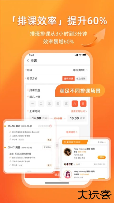 2、支持线上报名缴费、可视化排课、约课管理、场地预约及人脸识别签到,自动检测冲突并统计出勤率。