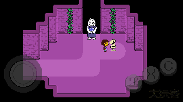 4、去到北面的藤蔓房间内会遇到青蛙froggit,选择“行动——赞美”,虽然青蛙不知道你在说什么,但他变得很开心,他就会逃离战斗。在右面的水池上有一个尖刺陷阱,Toriel会牵着你的手通过这个陷阱区域。
