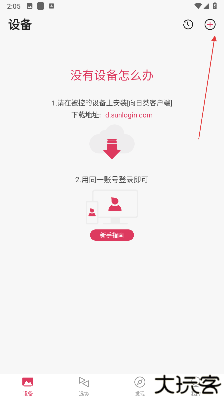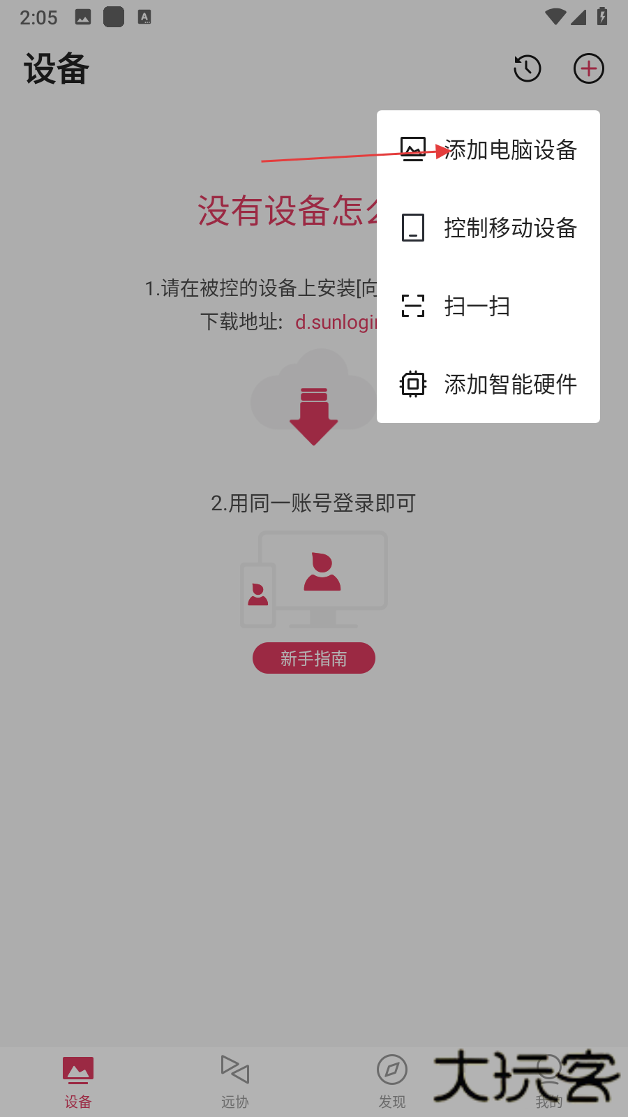 1、打开向日葵远程控制客户端app,进入主界面后点击下方设备选项,在设备页面点击右上角的+号按钮,打开添加设备菜单。