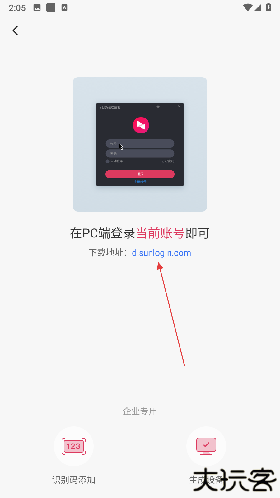 3、若电脑端已安装向日葵客户端,确保在电脑端登录与手机端相同的账号,若未安装,可点击界面中的下载地址,在电脑上下载安装客户端后登录账号,即可完成电脑设备添加。