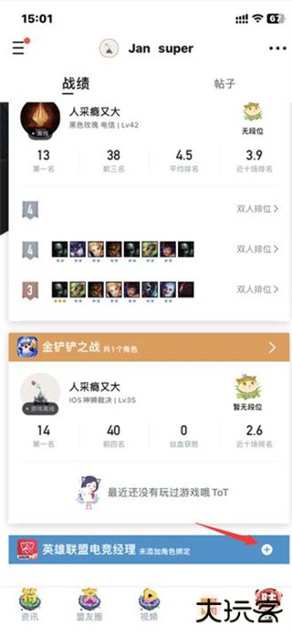 3、在战绩查询界面,点击箭头指示的加号按钮。