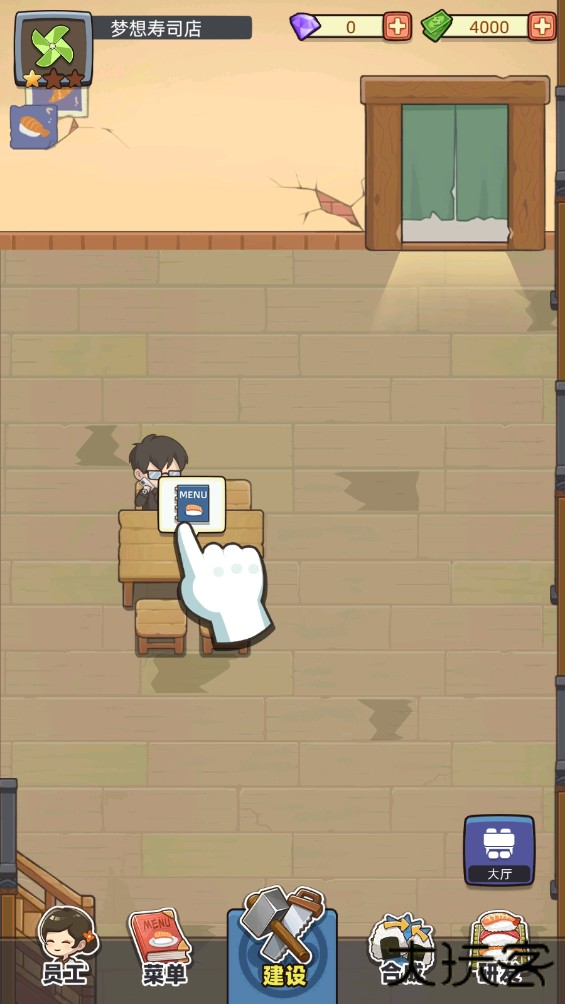 1、在本站下载安装游戏,启动后与小野凉太共同经营寿司店。完成店铺清洁工作,进入【建设】界面购买桌椅和厨房设备;