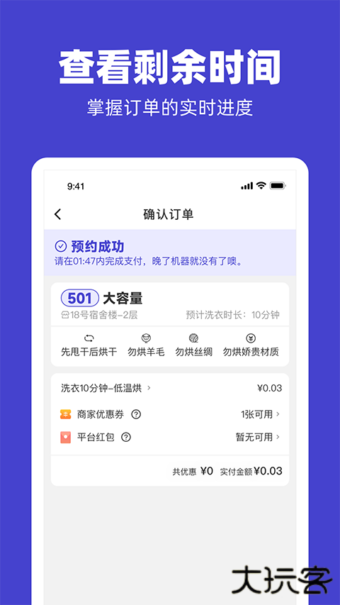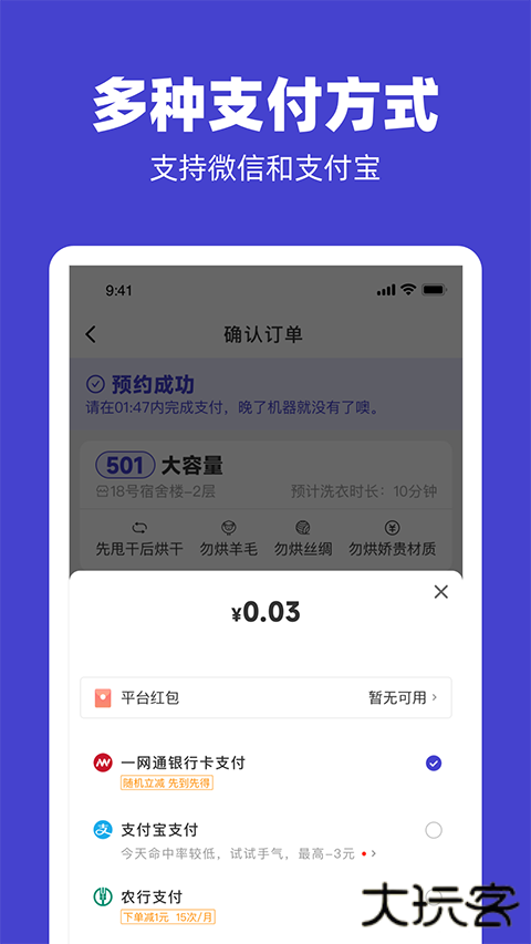 支持微信、支付宝或银行卡支付,支付失败可更换方式。启动后APP实时显示剩余时间,洗衣完成会推送通知。