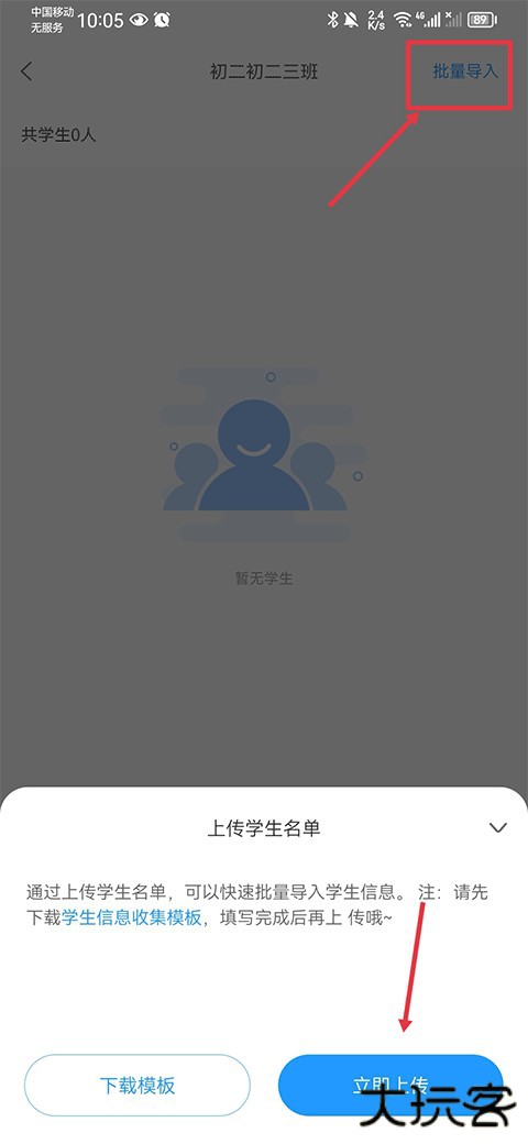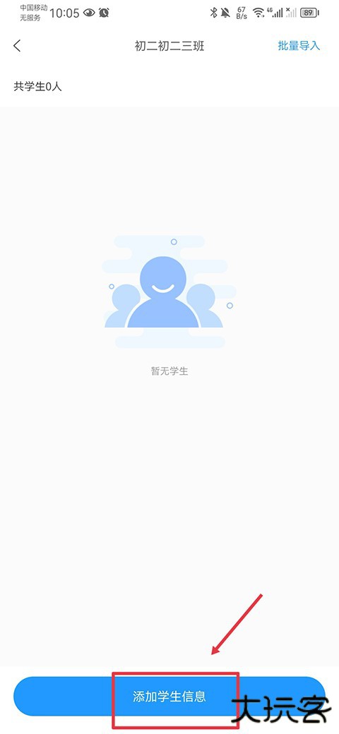 6、若需要添加多名学生可以点击右上角批量导入,然后上传学生名单