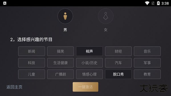 1、在本站下载听伴车机版,首次打开需要选择感兴趣的节目和性别,进行一键激活;