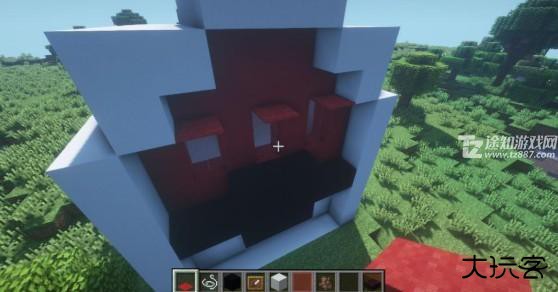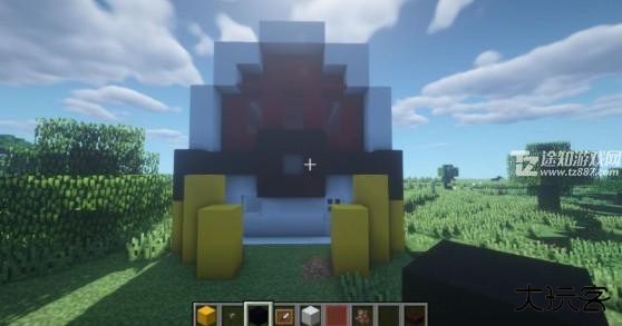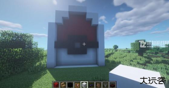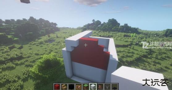 接下来很重要的一点,就是沿着下方图片中的横线放一些黑色的混凝土,中间可以做一个正方形出来,这样远距离观看就有些精灵球的味道啦。