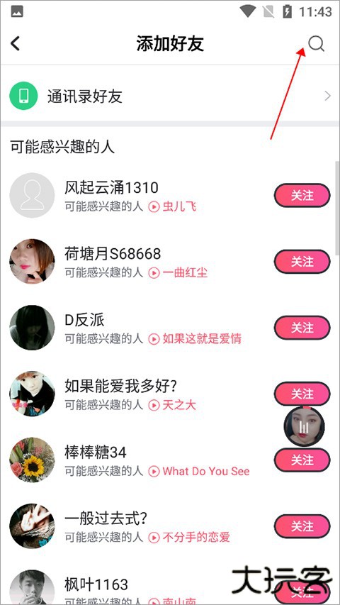 2、接着在打开的添加好友页面中,用户可以通过点击该页面顶部的搜索图标(下图红色箭头所指)搜索好友,也可通过点击【通讯录好友】将手机通讯录中的好友添加进来
