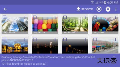 当应用程序开始扫描已删除文件时,您将看到diskdiggerpro主屏幕,该屏幕将开始填充可恢复文件: