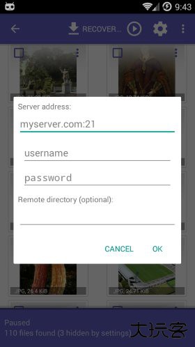 最后一种方法允许您将可恢复文件上传到 FTP 服务器。为此,您需要访问在线的 FTP 服务器,并使用正确的凭据来访问和上传到服务器。diskdiggerpro将显示一个对话框,供您输入 FTP 服务器的主机名,以及登录服务器的用户名和密码:
