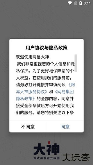 1、打开网易大神app,首次使用的话要点击同意,并且授予相关权限