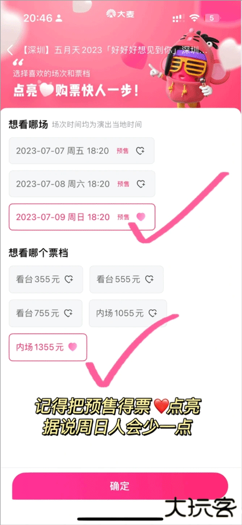 第六步:将你要观看的场次和票档后面的红心点上,这样在抢票时打开此界面就会直接默认为该场次和票档,就不用在浪费时间再点一次了
