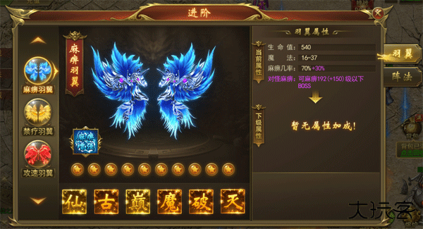 翅膀共分为3种,分别为攻速、禁疗、麻痹羽翼