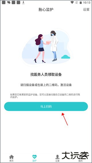 2、向医务人员领取设备后,单击“马上扫码”,扫描设备上的二维码。