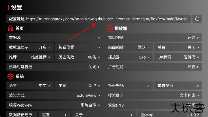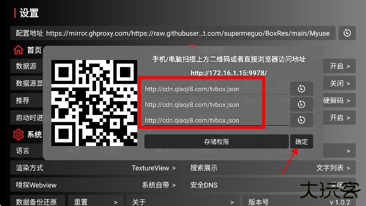 4、将上方提供的接口复制其中后点击确定后重新启动即可(推荐:http://cdn.qiaoji8.com/tvbox.json)